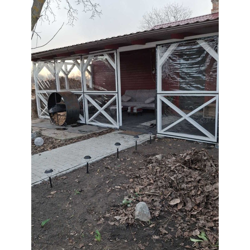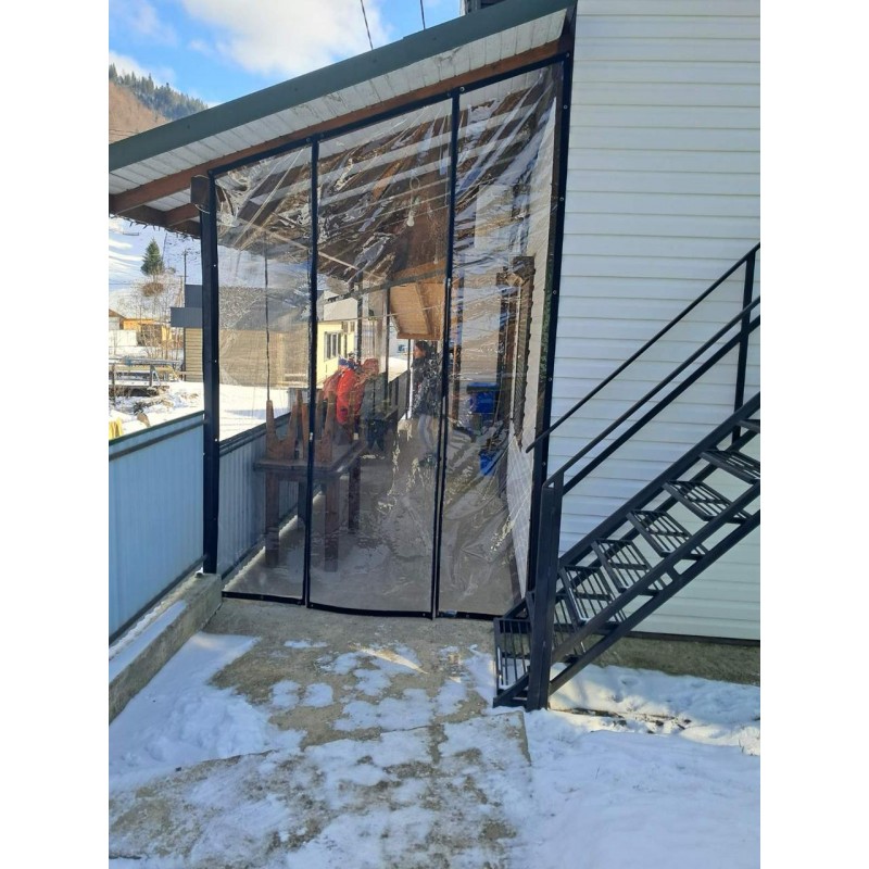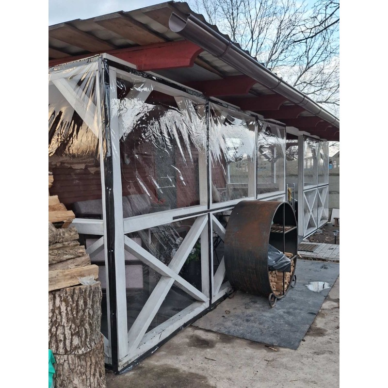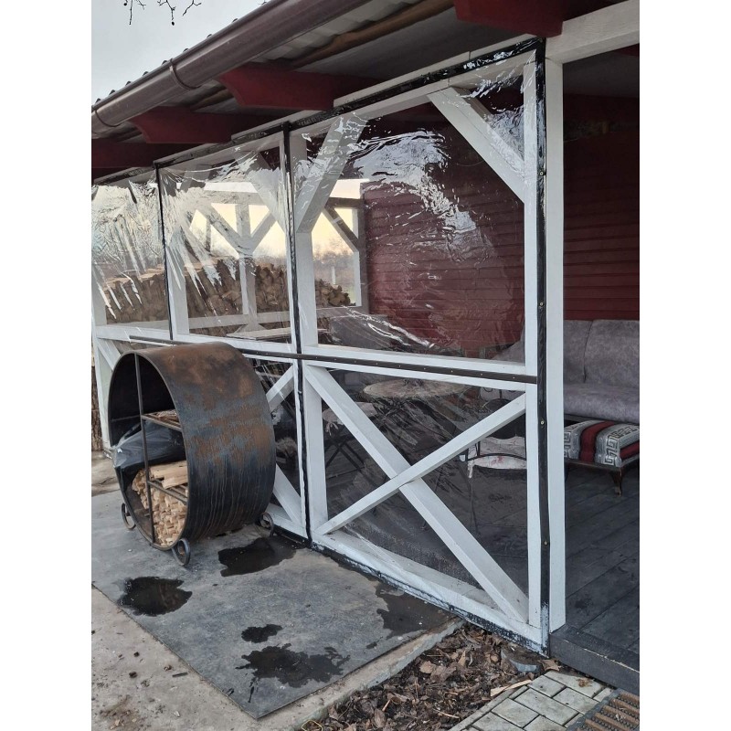 Мягкие окна, тип эконом, ПВХ 0,2 мм, пришита рамка из киперной ленты, шириной 40 мм, по периметру люверсы с интервалом 0,5 м ( для открывания можно добавить по краям молнии). вверху - фиксаторы рулона. В отличии от обычных мягких окон (ПВХ 0,5 мм),  эконом вариант имеет меньший срок эксплуатации (ориентировочно 1,5-2 года, в зависимости от внешних условий), рамки не ПВХ разных цветов и ширины, а черная киперная лента 4 см.